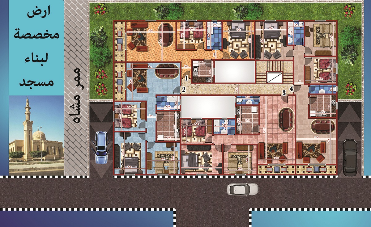 يوجد بالحي الاول بالقرب من طريق الاوتوستراد والطريق الدائري حيث سهوله الوصول اليه ويتميز انه يطل على ناصية بجوارة مسجد كبير و شارع رأسي امام واجهة المشروع يتمتع باكثر من فيو وتصميم جميل في الوجهات والتقسيم الداخلي بما يتوفر فيه جميع مؤهلات الراحة في السكن والسهولة في الاستثمار